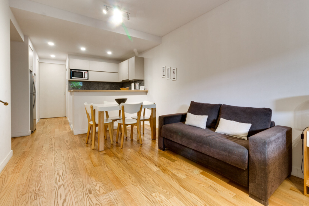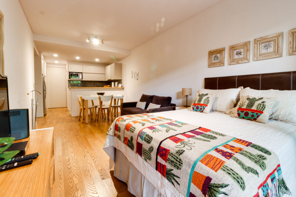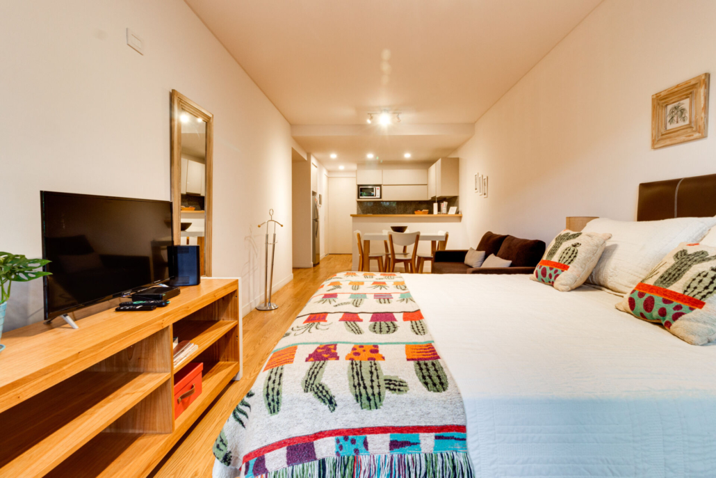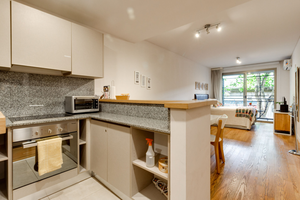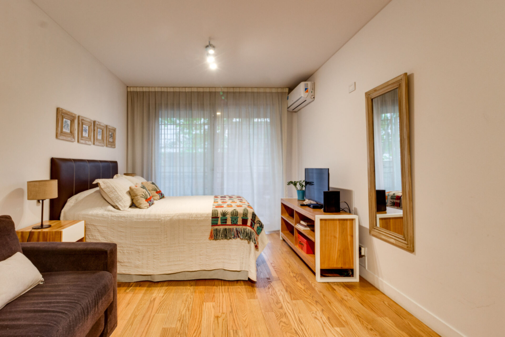 Posee dos placards, Pisos flotantes simil madera en el ambiente y de porcelanato en baño y cocina.