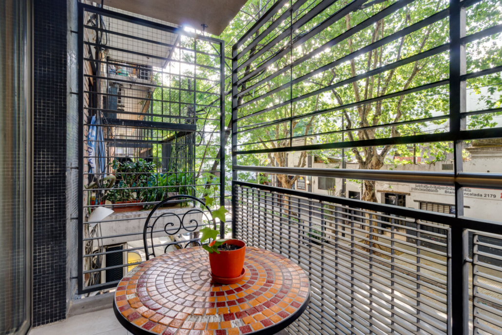 El balcón esta al frente ,tiene los pisos de porcelanato, una rejilla lineal exterior + canaleta a lo largo y protección de balcón