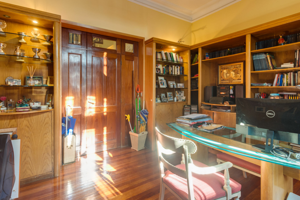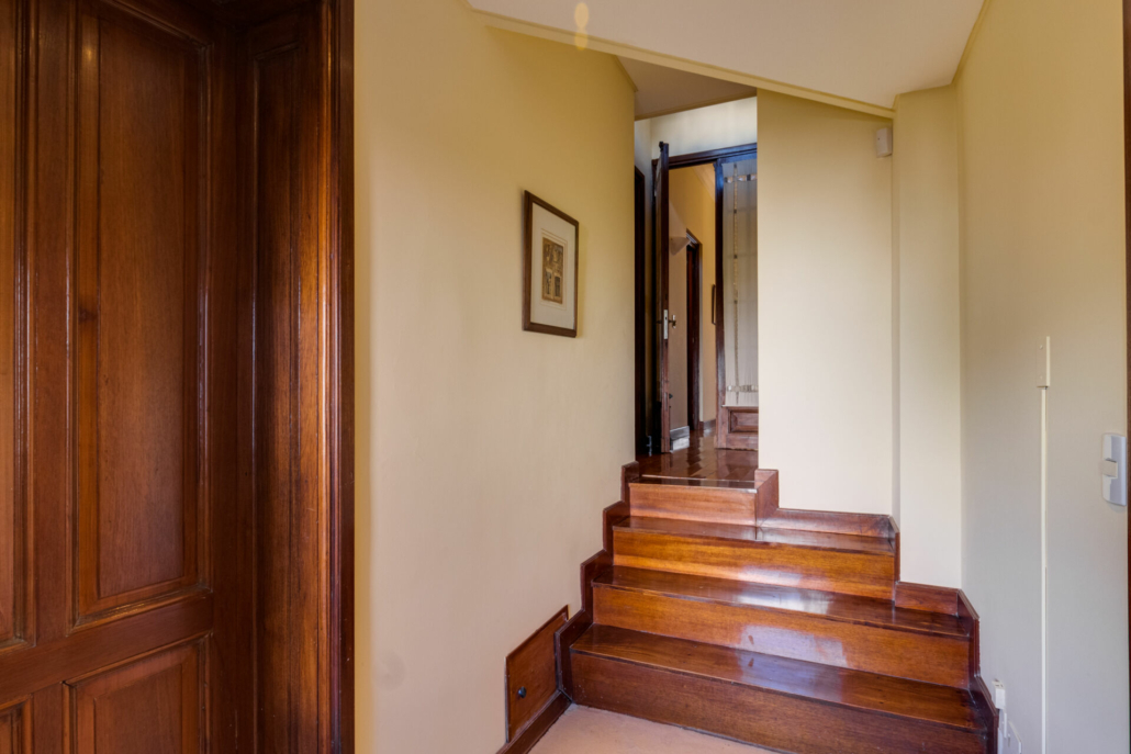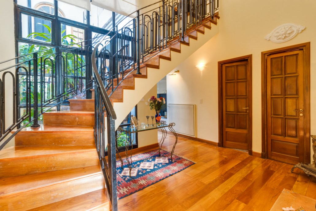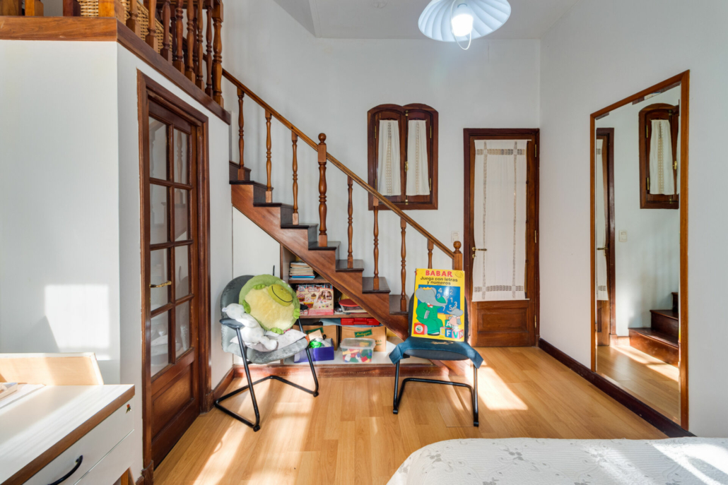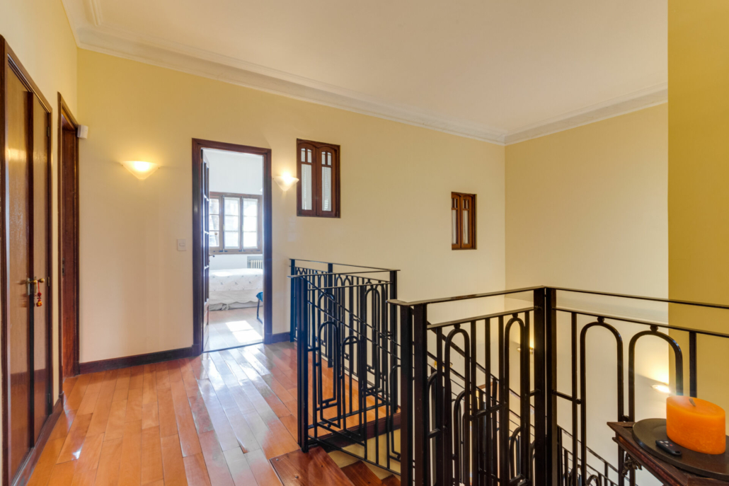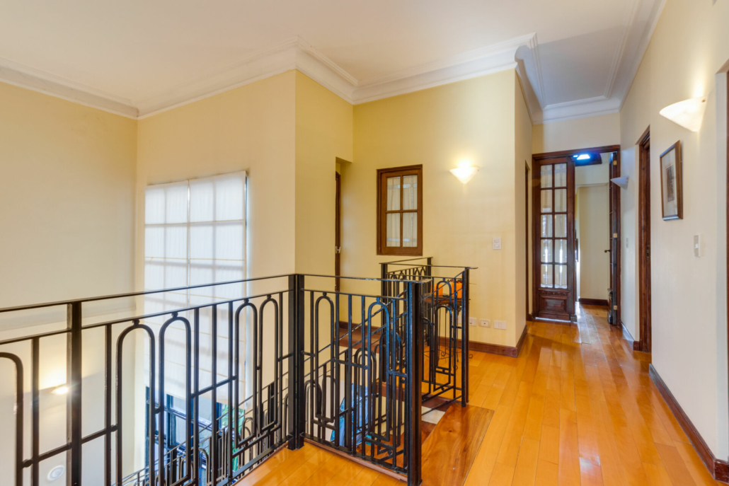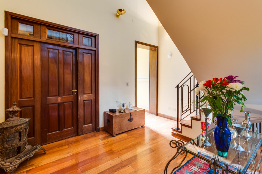 Pasillos, Hall de recepción y living con pisos de madera entarugados. La biblioteca en la planta baja y pasillo de la planta alta con pisos en pinotea. En la planta alta uno de los dormitorios tiene piso flotante simil madera y los otros están alfombrados.