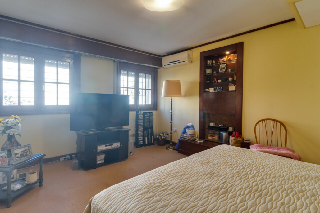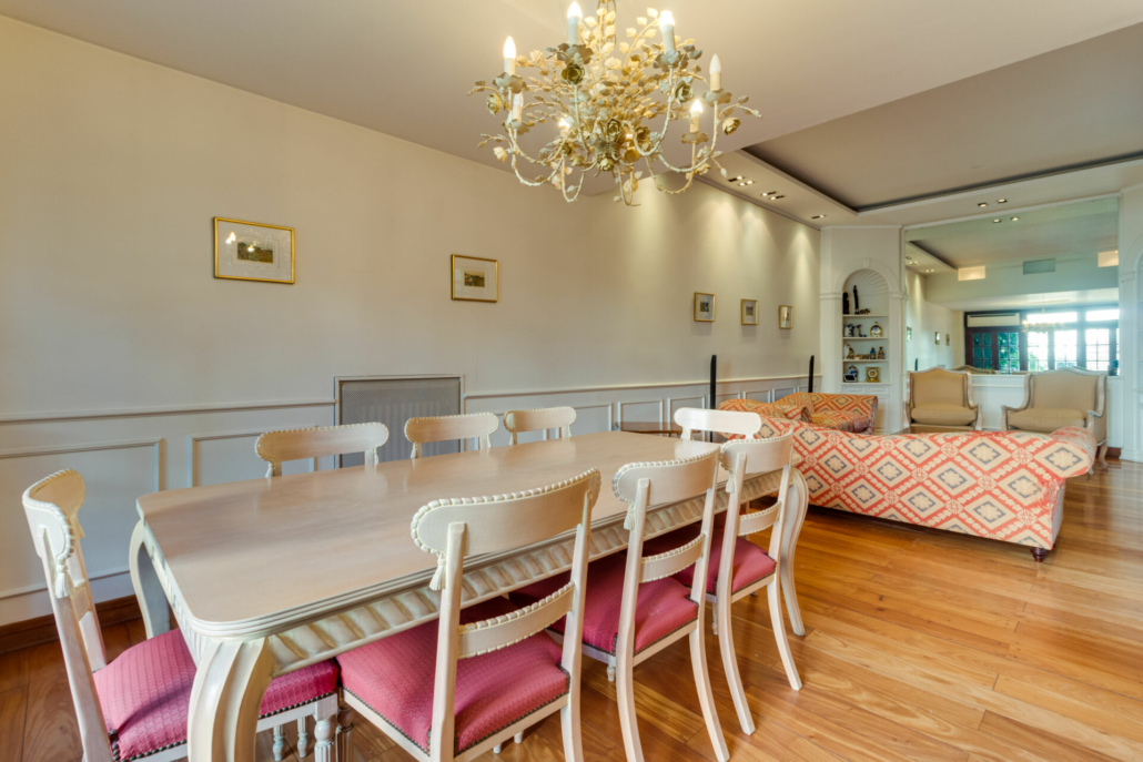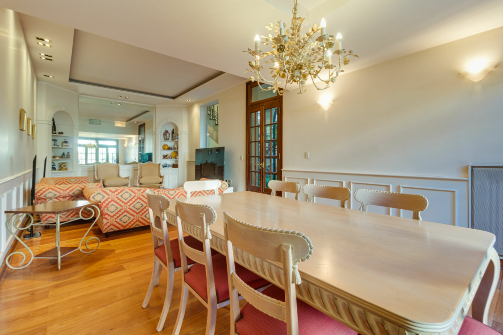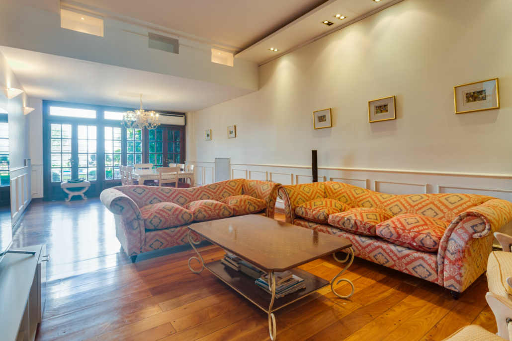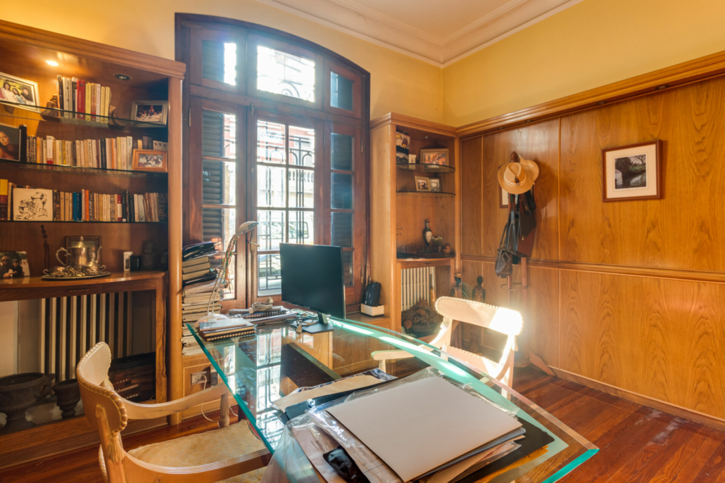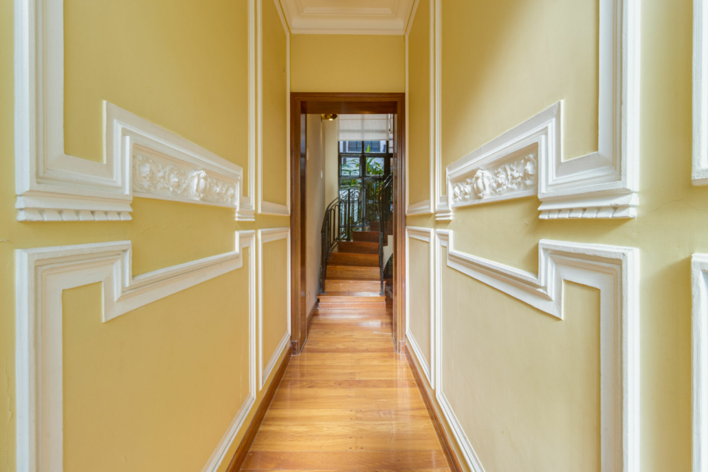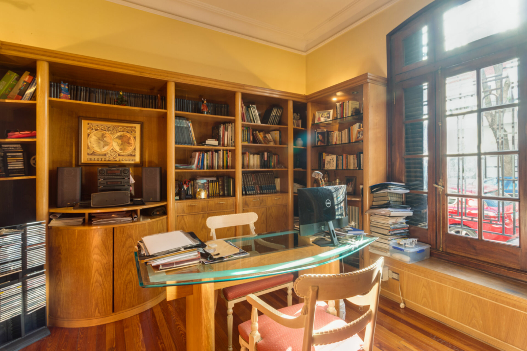 Pasillos, Hall de recepción y living con pisos de madera entarugados. La biblioteca en la planta baja y pasillo de la planta alta con pisos en pinotea. En la planta alta uno de los dormitorios tiene piso flotante simil madera y los otros están alfombrados.