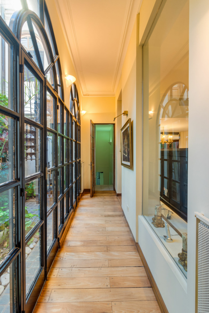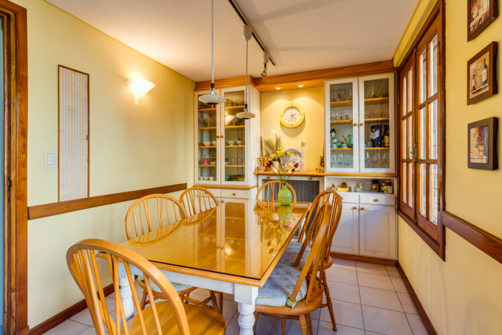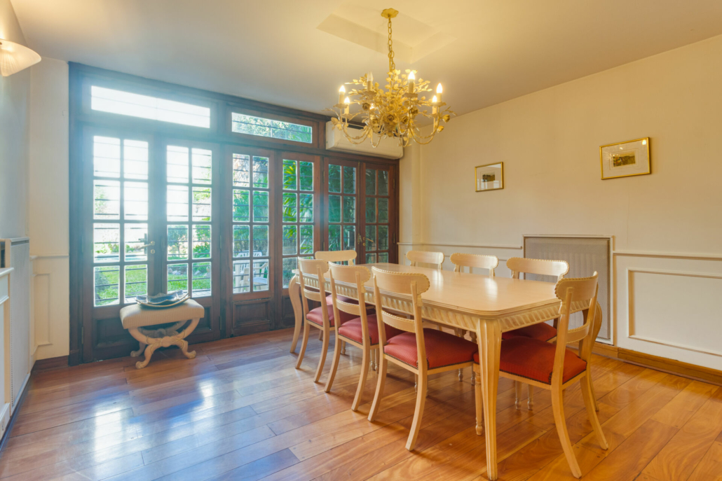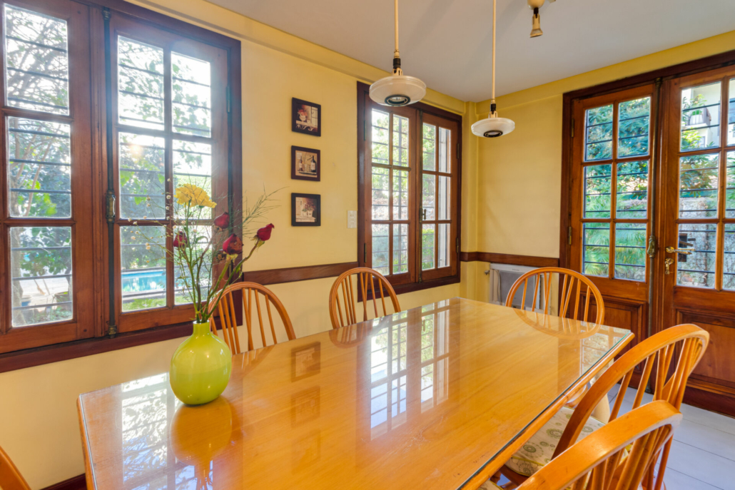 Puertas de hierro con vidrio repartido en el acceso al jardín desde el living y desde en comedor diario. También en el acceso al patio.