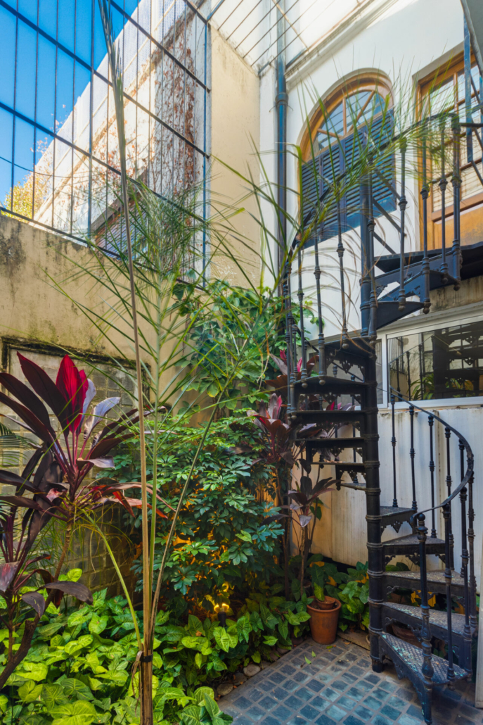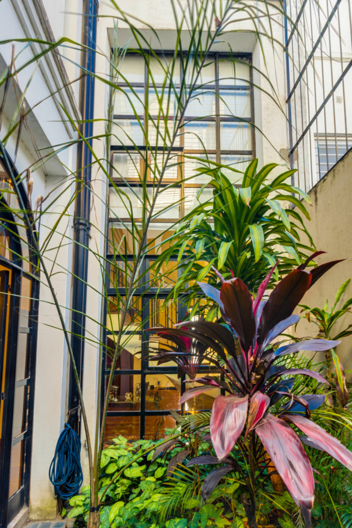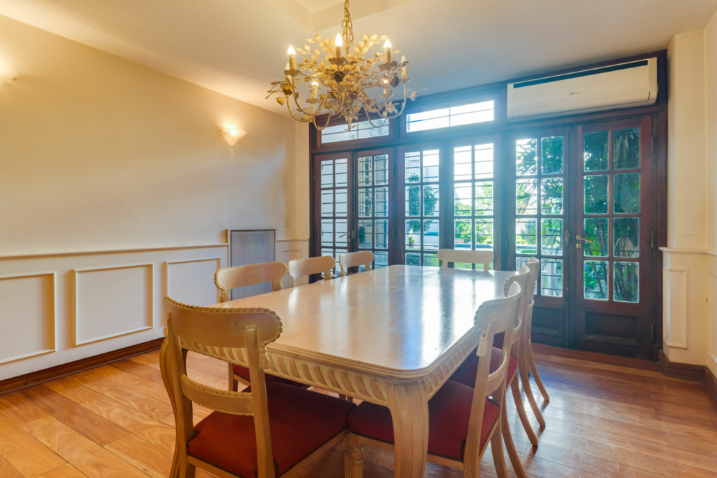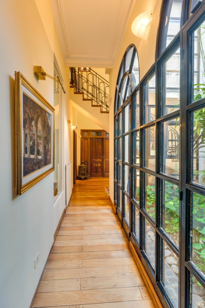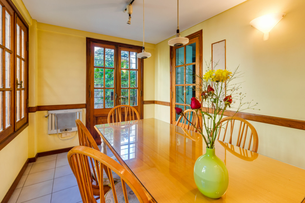 Puertas de hierro con vidrio repartido en el acceso al jardín desde el living y desde en comedor diario. También en el acceso al patio.